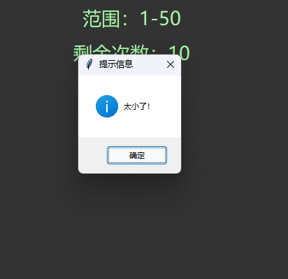 玩家每次猜测后会提示“太大了”或“太小了”,直到猜对或机会用尽。