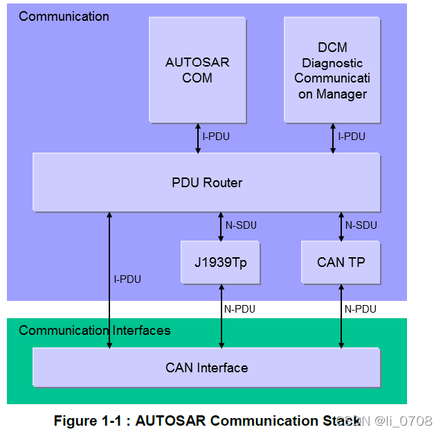 PDU-Router (PduR)将AUTOSAR COM和DCM i - pdu部署到不同的通信协议上(例如CAN或J1939,通过传输层分段或=直接)。 运行时,pdu根据I-PDU (L-SDU或N-SDU)标识来决定I-PDU路由到哪里。 同样,CanIf使用L-SDU (I-PDU或n - pdu)标识来决定接收到的消息是否必须由一个可用的传输层模块处理,或者可以直接转发给pdu。