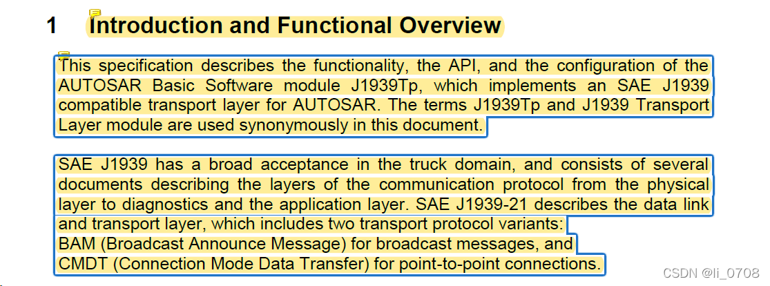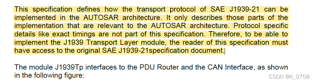 该规范定义了SAE J1939-21的传输协议如何在AUTOSAR体系结构中实现。 它只描述了与AUTOSAR体系结构相关的实现部分。 协议特定的细节,如精确的计时,不属于本规范的一部分。 因此,为了能够实现J1939传输层模块,本规范的读者必须能够访问原始的SAE J1939-21规范文档。