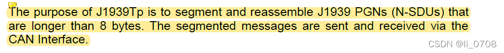 J1939Tp的目的是分割和重组大于8字节的j1939pgn (n - sdu)。 分段报文通过CAN接口发送和接收。