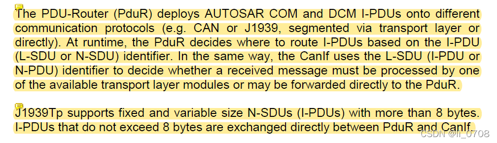 J1939Tp支持8字节以上的固定大小和可变大小的i - pdu (n - sdu)。不超过8字节的i - pdu在PduR和CanIf之间直接交换。