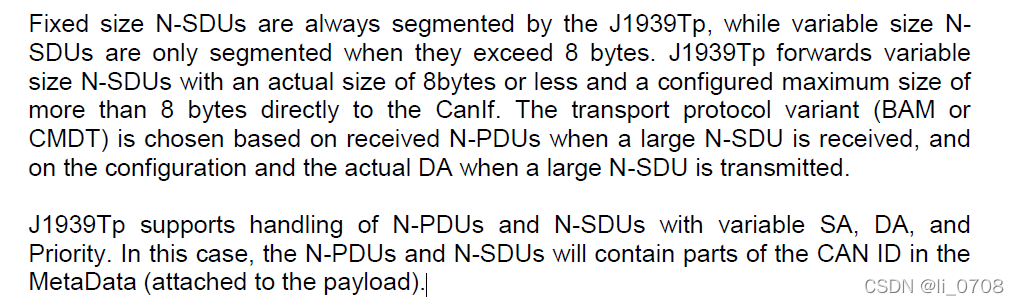 J1939Tp支持处理可变SA、DA和优先级的n - pdu和n - sdu。 在这种情况下,n - pdu和n - sdu中会包含部分CAN ID的元数据(附着在负载上)。