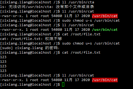s:文件属主和组设置SUID和GUID,文件在被设置了s权限后将以root身份执行,具备临时的提升的权限。在设置s权限时文件属主、属组必须先设置相应的x权限,否则s权限并不能正真生效