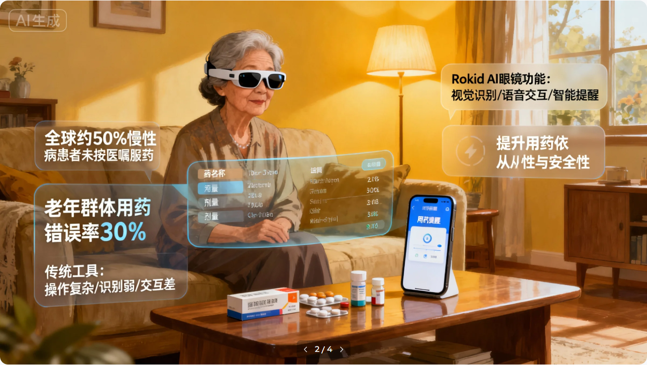 Rokid AI眼镜凭借其轻便的可穿戴特性、第一视角交互优势以及强大的AI处理能力,为药品管理提供了全新解决方案。通过整合视觉识别、语音交互、智能提醒等功能,能够为用户提供无缝、自然的用药辅助体验,显著提升用药依从性和安全性。