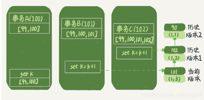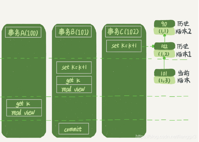 这样子,事务A的视图数组就是[99,100], 事务B的视图数组是[99,100,101], 事务C的视图数组是[99,100,101,102]。
