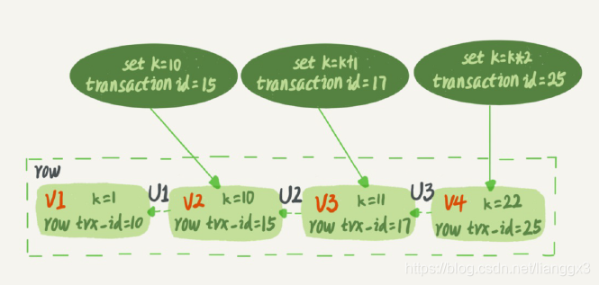 图中虚线框里是同一行数据的4个版本,当前最新版本是V4,k的值是22,它是id为25的事务更新的,因此它的row trx_id也是25。