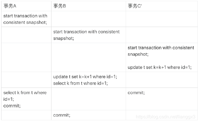 所以,这时候事务A查询语句返回的是k=2。事务B查询结果k=3。