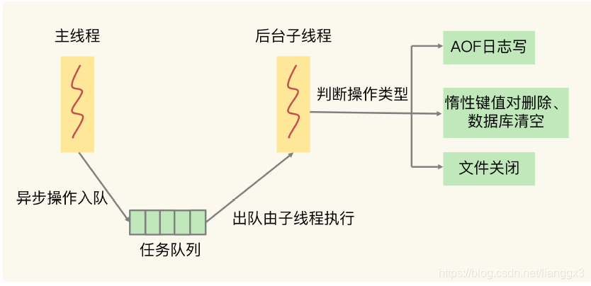 主线程通过一个链表形式的任务队列和子线程进行交互。当收到可以进行异步操作的命令时,主线程会把这个操作封装成一个任务,放入到任务队列中,然后给客户端返回一个完成信息,表明操作已经完成。