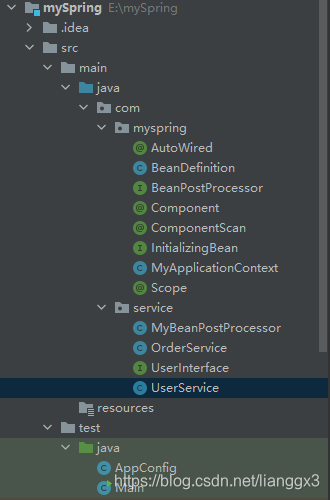 这是一个简化的Spring框架实现示例,包括组件扫描、依赖注入、初始化处理和AOP代理。`MyApplicationContext`类负责加载配置类,扫描带有`Component`注解的类,并创建bean。`BeanDefinition`存储bean信息,`ComponentScan`、`Scope`、`AutoWired`定义bean的元数据。`UserService`和`OrderService`作为示例bean,实现了`InitializingBean`接口并使用`AutoWired`注解进行依赖注入。`MyBeanPostProcessor`实现了`BeanPostProcessor`接口,用于在bean初始化前后进行处理,展示了AOP代理的概念。