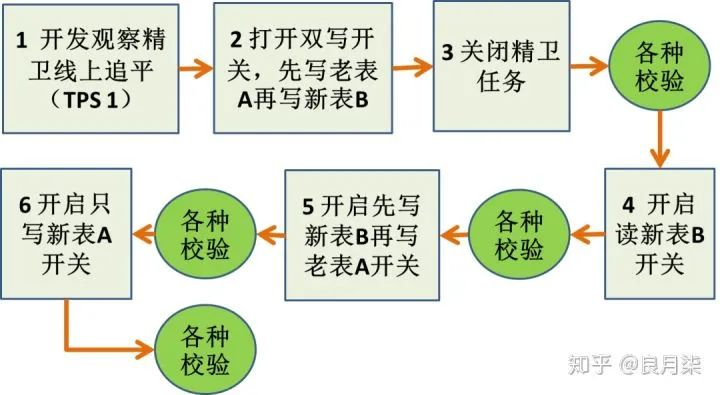 第2步“打开双写开关,先写老表A再写新表B”,这时候确保写B表时try catch住,异常要用很明确的标识打出来,方便排查问题。第2步双写持续短暂时间后(比如半分钟后),可以关闭binlog同步任务。优点:1)将复杂任务分解为一系列可测小任务,步步为赢;2)线上不停服,回滚容易;3)字符集问题影响小缺点:1)流程步骤多,周期长;2)双写造成RT增加