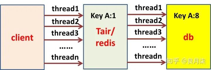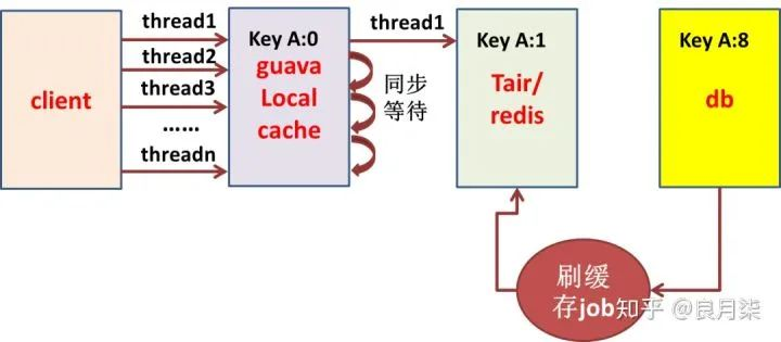 如果我们再增加一层本地缓存(guava,比如超时时间设置为1秒),保证单机对一个key只有一个请求回源,那样对tair/redis这层资源的使用就可以预知了。假设有500台client,对一个key来说,一瞬间最多500个请求穿透到Tair/redis,以此类推到db。