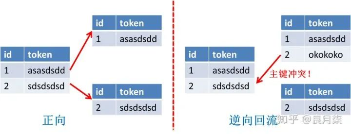 正向迁移扩容中,通过自增的主键,到了新的分库分表里一定是唯一的,但是,我们要考虑迁移失败的场景,如下图所示,新的表里假设已经插入了一条新的记录,主键id也是2,这个时候假设开始回滚,需要将两张表的数据合并成一张表(逆向回流),就会产生主键冲突!
