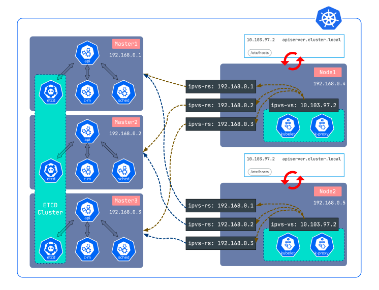 sealer 的集群高可用使用了轻量级的负载均衡 lvscare。相比其它负载均衡,lvscare 非常小仅有几百行代码,而且 lvscare 只做 ipvs 规则的守护,本身不做负载非常稳定,直接在 node 上监听 apiserver,如果跪了就移除对应的规则,重新起来之后会自动加回,相当于是一个专用的负载均衡器,在 sealos 项目中也用了两年多,有广泛的实践。