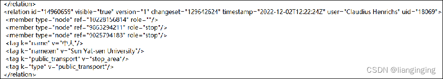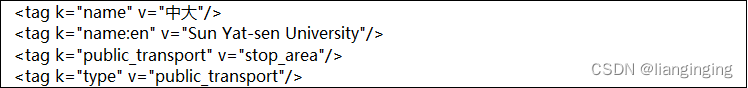 tag部分通过k-v键值来表达该部分的含义,比如当k指向“name”的时候,表达的是该部分的名称是什么,比如图中名称为“中大”;当k指向“type”的时候,表达的是该部分的类型是什么,比如图中说明类型是“public_transport”。