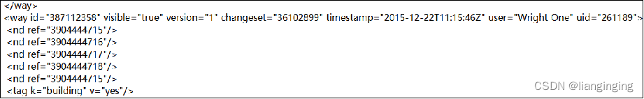 way部分由多个node组成,因此way部分还包含了多个node id(nd),并且组成的way具有其相应的tag,用于表示这个way到底表示什么。