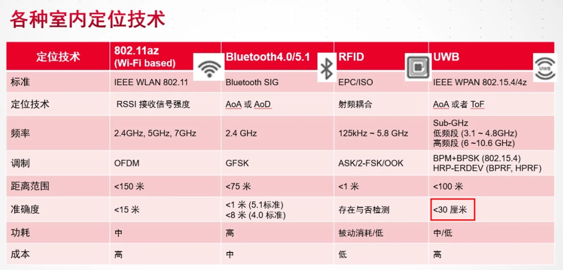 如上图,具体的技术比较不多说,UWB能上位的最最重要的原因就是定位的准确度。对于室内定位而言,太大的定位误差不具有应用意义;而UWB的技术特性使得它能够把定位技术缩小在30厘米之内,现在的方案可以做到小于12厘米,这是其他技术所没有的特性。