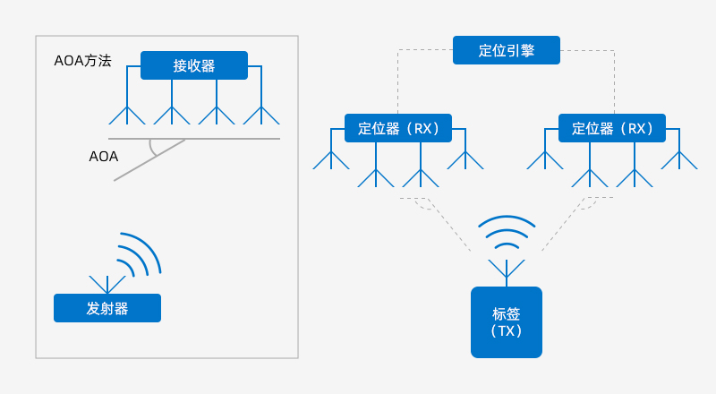 蓝牙5.1标准引入了AoA特性,蓝牙AoA定位就是运用外部追寻体系丈量某个对象的方位或视点,追寻设备在使用环境中的方位;AoA定位算法又叫到达角度测距(Angle-of-Arrival,简称AoA),是一种基于蓝牙信号到达角度的蓝牙定位算法,如图