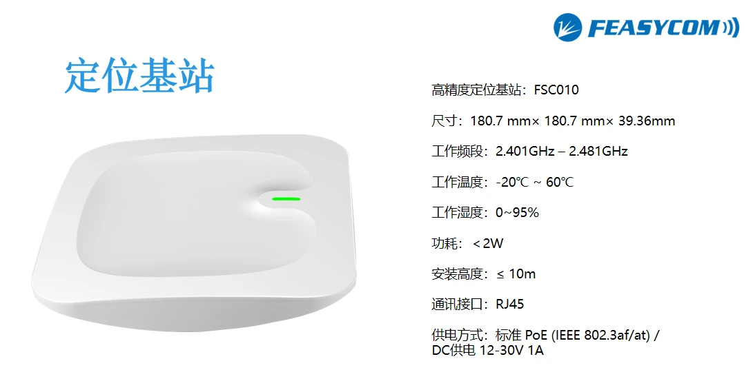 (二)蓝牙AOA系统的基础是:基站和标签,飞易通推出的定位硬件产品包括蓝牙AOA定位基站和蓝牙AOA定位标签,定位精度可达0.1~0.5m。