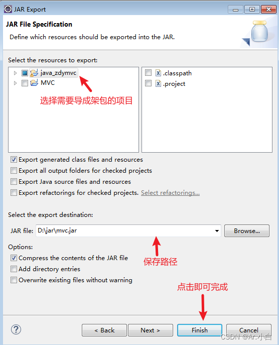 - 默认只导出 class 文件。你也可以通过勾选 "Export Java source files and resources" 选项来导出源码的内容。