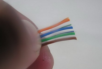 第二步:排序:剥除灰色的塑料保护层之后即可见到双绞线网线的4对8条芯线,并且可以看到每对的颜色都不同。每对缠绕的两根芯线是由一种染有相应颜色的芯线加上一条只染有少许相应颜色的白色相间芯线组成。四条全色芯线的颜色为:棕色、橙色、绿色、蓝色。每对线都是相互缠绕在一起的,制作网线时必须将4个线对的8条细导线逐一解开、理顺、扯直,然后按照规定的线序排列整齐。