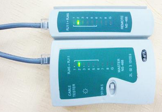 第五步:测试, 使用测线仪对做好的网线进行测试,将测线器两端各接水晶头,两端接如果亮的顺序一致即可。如果出现亮的顺序不同,则可能是将线放入水晶头时线序发生了移位,如果某些灯没亮,则可能是使用网线钳按压水晶头时力度不够导致,此时只能剪掉重新制作。