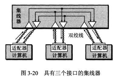 集线器(Hub)实质上是一个多端口的中继器,不能存储转发。它的每个接口仅仅简单地转发比特——收到1就转发1,收到0就转发0,不进行碰撞检测。若两个接口同时有信号输入(即发生碰撞),那么所有的接口都将收不到正确的帧。下图是具有三个接口的集线器的示意图。