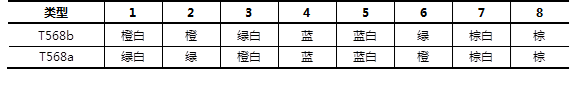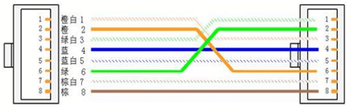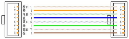 直通线:T568b<-->T568b(推荐,如下图所示),或者T568a<-->T568a(不常用) 。