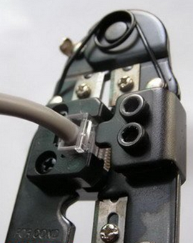 将接好线的水晶头放到网线钳的压线口内(注意要捏住网线,往里顶紧),然后握住网线钳使劲压紧(线与线头不能有松动),如下图所示,以确保水晶头的铜触片嵌入双绞线的芯线。