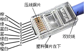 排列好的每条芯线分别对应RJ-45水晶头的1-8针脚,如下图所示