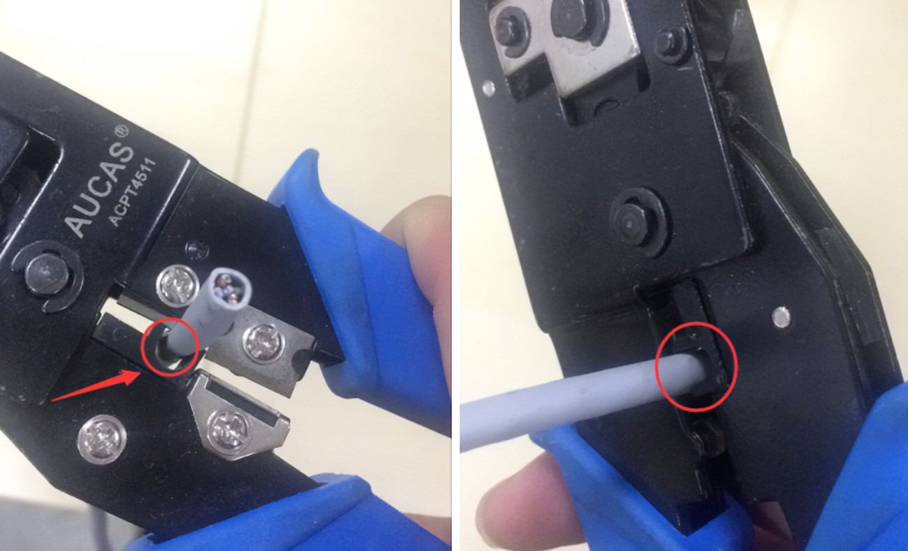 第四步:压线,确认无误之后就可以把水晶头插入压线钳的8P槽内压线了,把水晶头插入后,用力握紧线钳,若力气不够的话,可以使用双手一起压,这样一压的过程使得水晶头凸出在外面的针脚全部压入水晶并头内。