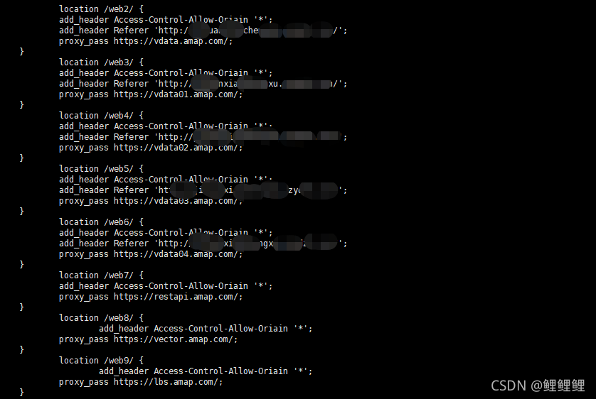 <2>配置代理服务,在nginx/conf/nginx.conf中添加以下配置,此处需要注意,若是在高德账号控制台中已经指定了可访问的域名,需要在转发请求规则中配置请求头(转发规则匹配map.js)。