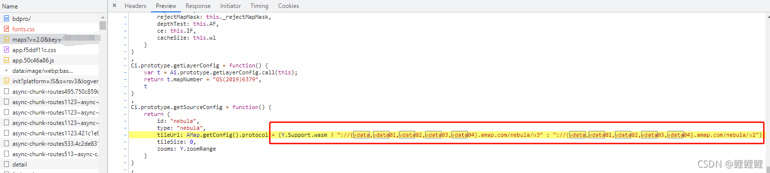 通过分析高德地图的整体流程,发现在地图初始化时会优先去调取一个https://webapi.amap.com/maps的接口,返回js文件,后续的瓦片、路况等等后台接口的url均暗藏在此js中,并在此js中做了负载均衡,如下图所示;