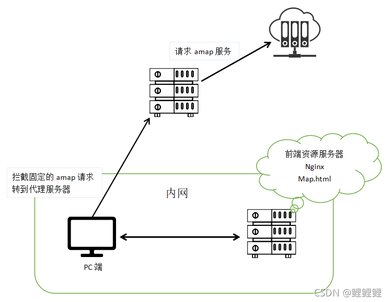 初始的想法是部署一台代理服务器,代理服务器网络既能连接内网,又能连接外网,通过前端对指向amap固定url的请求进行拦截,将请求转发至代理服务器,由代理服务器的nginx将请求转发至高德后台获取数据,并返回到前端。