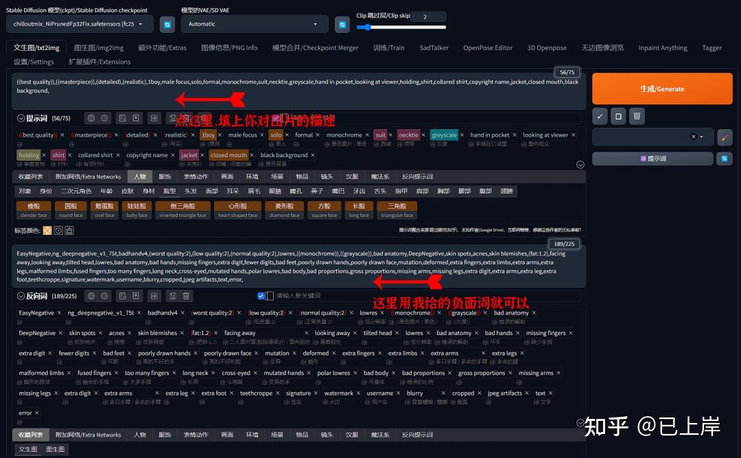 - 负向词用这个:EasyNegative, ng_deepnegative_v1_75t, badhandv4,(worst quality:2), (low quality:2), (normal quality:2), lowres, ((monochrome)), ((grayscale)), bad anatomy,DeepNegative, skin spots, acnes, skin blemishes,(fat:1.2),facing away, looking away,tilted head, lowres,bad anatomy,bad hands, missing fingers,extra digit, fewer digits,bad feet,poorly drawn hands,poorly drawn face,mutation,deformed,extra fingers,extra limbs,extra arms,extra legs,malformed limbs,fused fingers,too many fingers,long neck,cross-eyed,mutated hands,polar lowres,bad body,bad proportions,gross proportions,missing arms,missing legs,extra digit, extra arms, extra leg, extra foot,teethcroppe,signature, watermark, username,blurry,cropped,jpeg artifacts,text,error