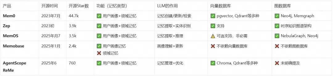 不同长期记忆产品在信息组织维度上有所差异:一些产品主要关注个人信息(个人记忆),而一些产品除了支持个人记忆外,还支持工具记忆、任务记忆等更丰富的维度。