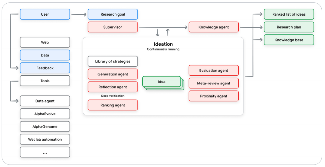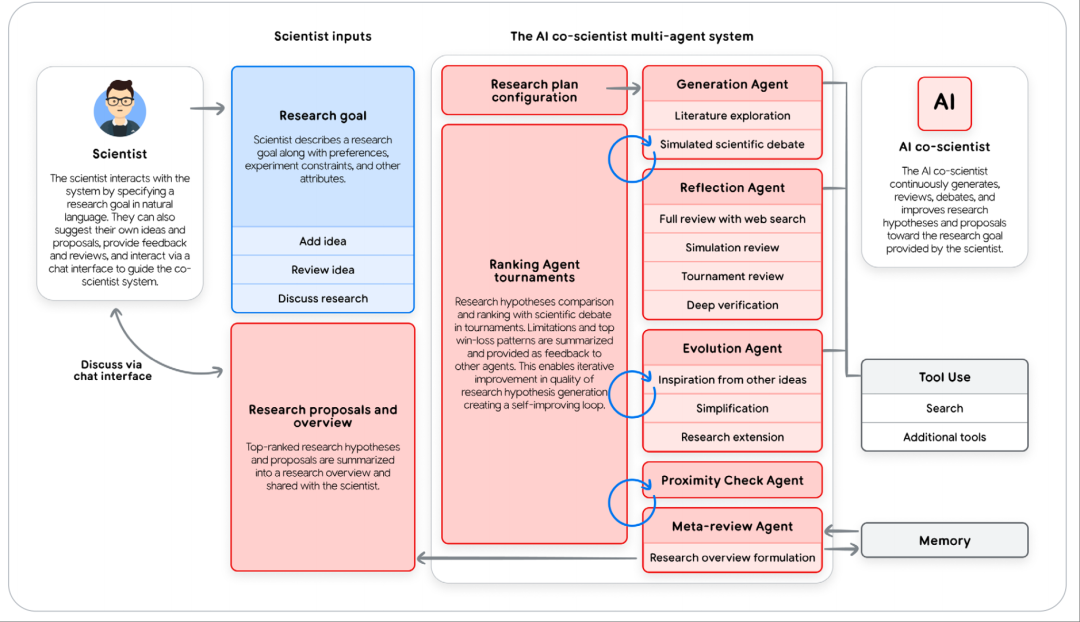Google Co-Scientist:作为虚拟研究协作者的多智能体系统,能生成和评估科学假设。它包含生成、反思、进化、排名等多个specialized agents,在“监督者”智能体的协调下,通过模拟科学辩论和锦标赛进行迭代改进。