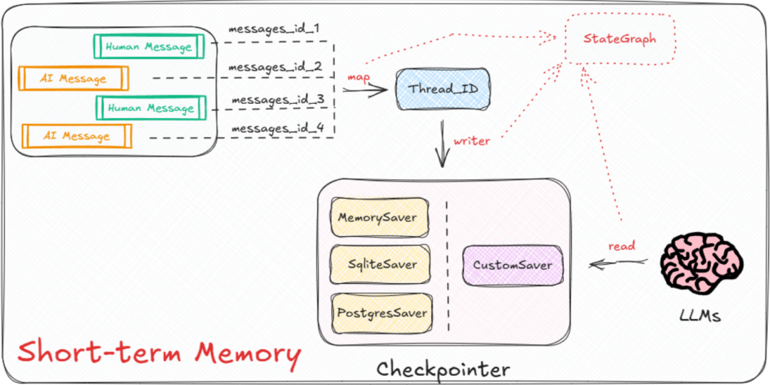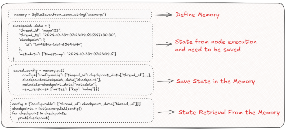 最简单的实现方式是MemorySaver,它把历史数据存在内存里。适合开发测试阶段使用。