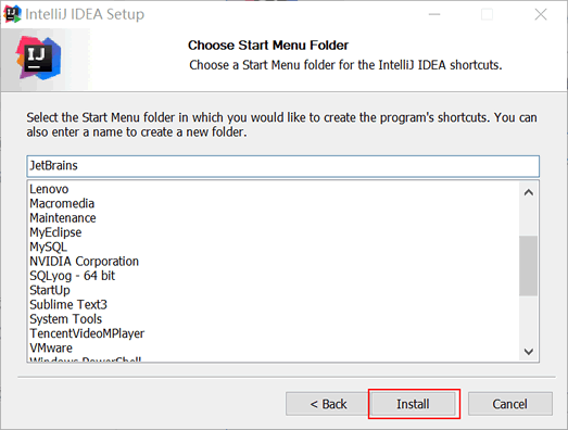 7)选择开始菜单文件夹后,点击 Install 等待安装。