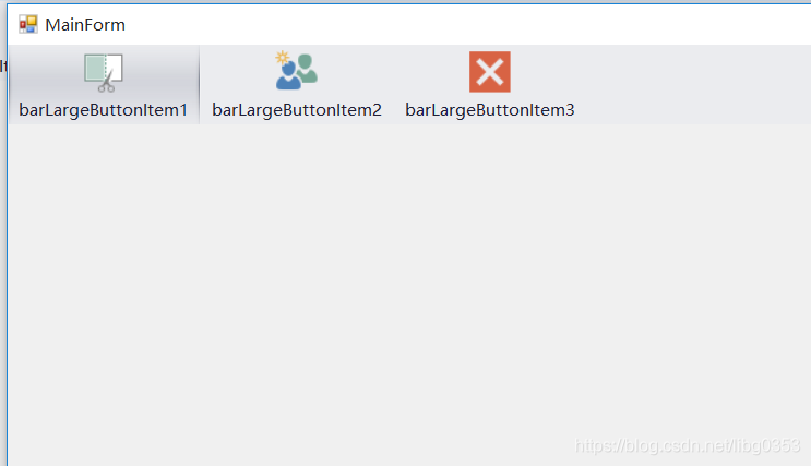 右键BarManager,将显示设计时刻增强(ShowDesignTimeEnhancements)勾去,bar工具栏(第二行)的属性Visible设为false,底部状态栏属性Visible设为false。再将显示设计时刻增强打上勾,在第一行主菜单添加三个Large Button(LargeButton可以在图片下方显示文字),LargeButton的属性的LargeGlyph可以导入图片。