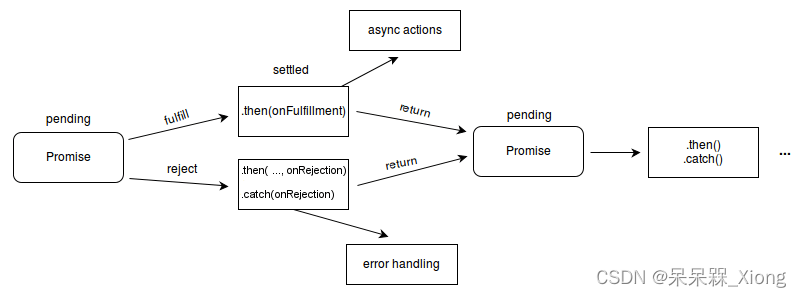 一个Promise的终止条件决定了链中下一个Promise的“已敲定”状态。fulfilled表示Promise成功完成,rejected表示Promise执行失败。链中成功的Promise返回值传递给下一个.then(),而已拒绝的Promise把失败的原因传递给链中下一个拒绝处理函数。