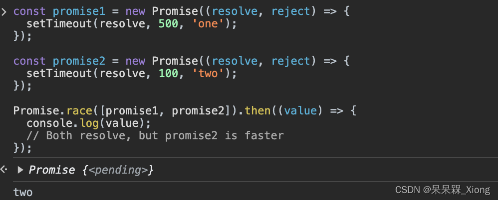Promise.race() 静态方法接受一个 promise 可迭代对象作为输入,并返回一个 Promise。这个返回的 promise 会随着第一个 promise 的敲定而敲定。