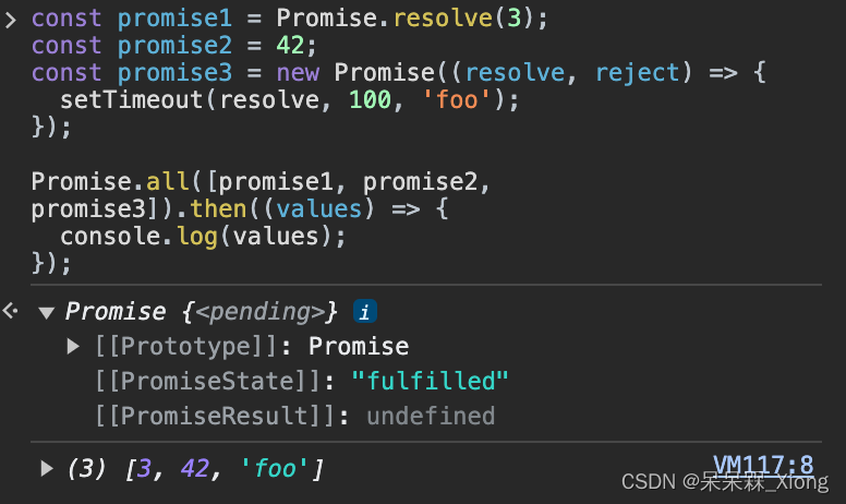 Promise.allSettled() 静态方法将一个 Promise 可迭代对象作为输入,并返回一个单独的 Promise。当所有输入的 Promise 都已敲定时(包括传入空的可迭代对象时),返回的 Promise 将被兑现,并带有描述每个 Promise 结果的对象数组。