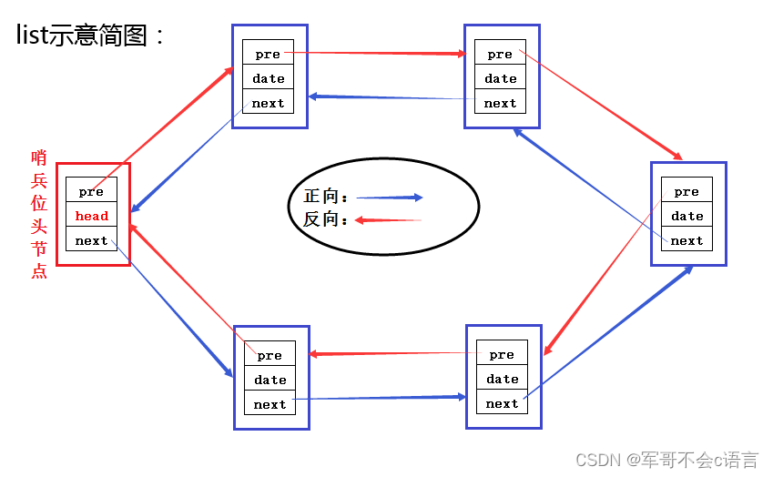 list的节点中有三个成员变量(哨兵位头节点除外),分别是:有效数据date、指向下一个节点的指针变量next、指向前一个节点的指针变量pre,哨兵位头节点不存储有效数据,只有两个指针变量。