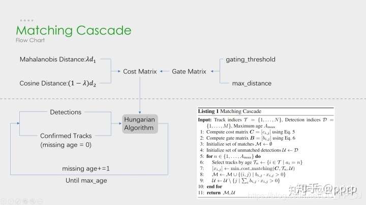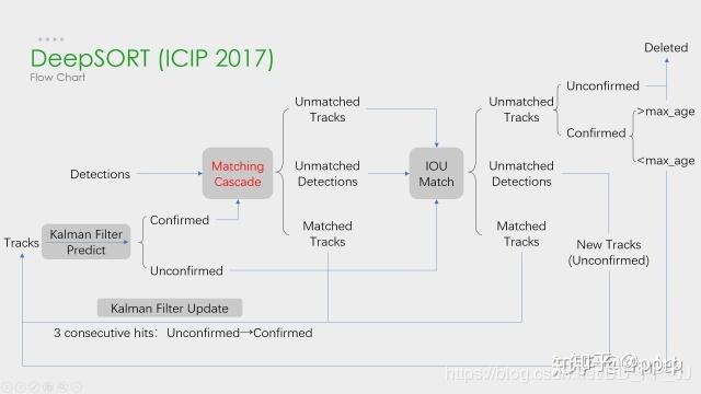 可以看出,Deep SORT 算法在 SORT 算法的基础上增加了 级联匹配(Matching Cascade)+新轨迹的确认(confirmed)。