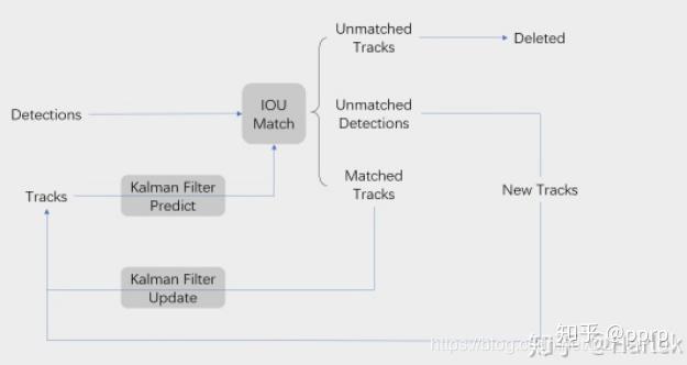 Detections 是通过目标检测器得到的目标框,Tracks是一段轨迹。核心是匹配的过程与卡尔曼滤波的预测和更新过程。