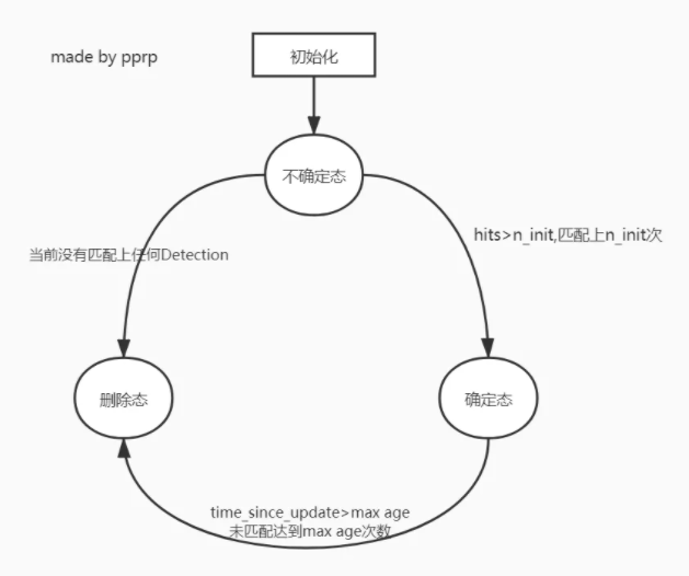 如果 detection 没有和现有 track 匹配上的,那么将对这个 detection 进行初始化,转变为新的 Track。新的 Track 初始化的时候的状态是未确定态,只有满足连续三帧都成功匹配,才能将未确定态转化为确定态。