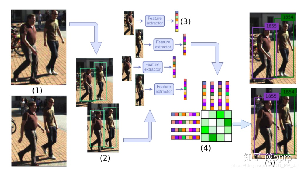 - 将所有目标框中对应的目标抠出来,进行特征提取(包括表观特征或者运动特征)。