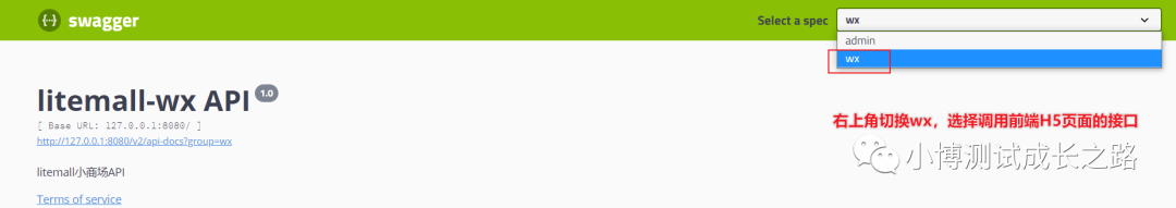 说明:之所以要右上角切换wx分支,是因为wx分组的登录接口不需要验证码,admin分组的登录接口要验证码,稍微麻烦点。