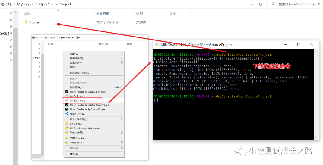 找一个目录,然后鼠标右键,选择Git Bash Here,在弹出的窗口中输入如下命令: