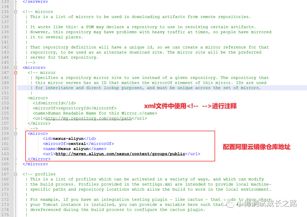 修改方式:进入到maven安装的目录后,找到conf文件夹,然后找到里面的settings.xml,用文本文件打开进行编辑:大概在140多行的样子,或者搜索mirrors标签,然后加入如下的配置: